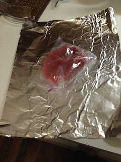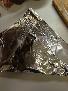 5. Tear off two sheets of aluminum foil that are large enough to wrap each chicken breast individually. Spray the side that you are going to put the chicken on with cooking spray. (You can skip this step, but sometimes it sticks and if you do this, it is less likely to do so.) Place a chicken breast on the prepared foil. Then you are going to do an envelope fold. Meaning first you loosely fold the bottom corner of foil over the chicken, cover the chicken completely but not meeting the top corner of the foil.