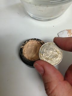 5. Take a piece of paper towel and place it over the paste. Press slightly with your finger tip to soak up some of the rubbing alcohol. Lift up and place a dry piece of paper towel on the paste and press down with the mold. For round eye-shadow compacts, a quarter or nickel works well. If you are repairing blush or face powder, then you can often use another container in your make-up bag or the lid of the container itself if it is a screw top. Carefully lift up the paper towel. You will see the pattern of the paper towel is impressed on the powder.