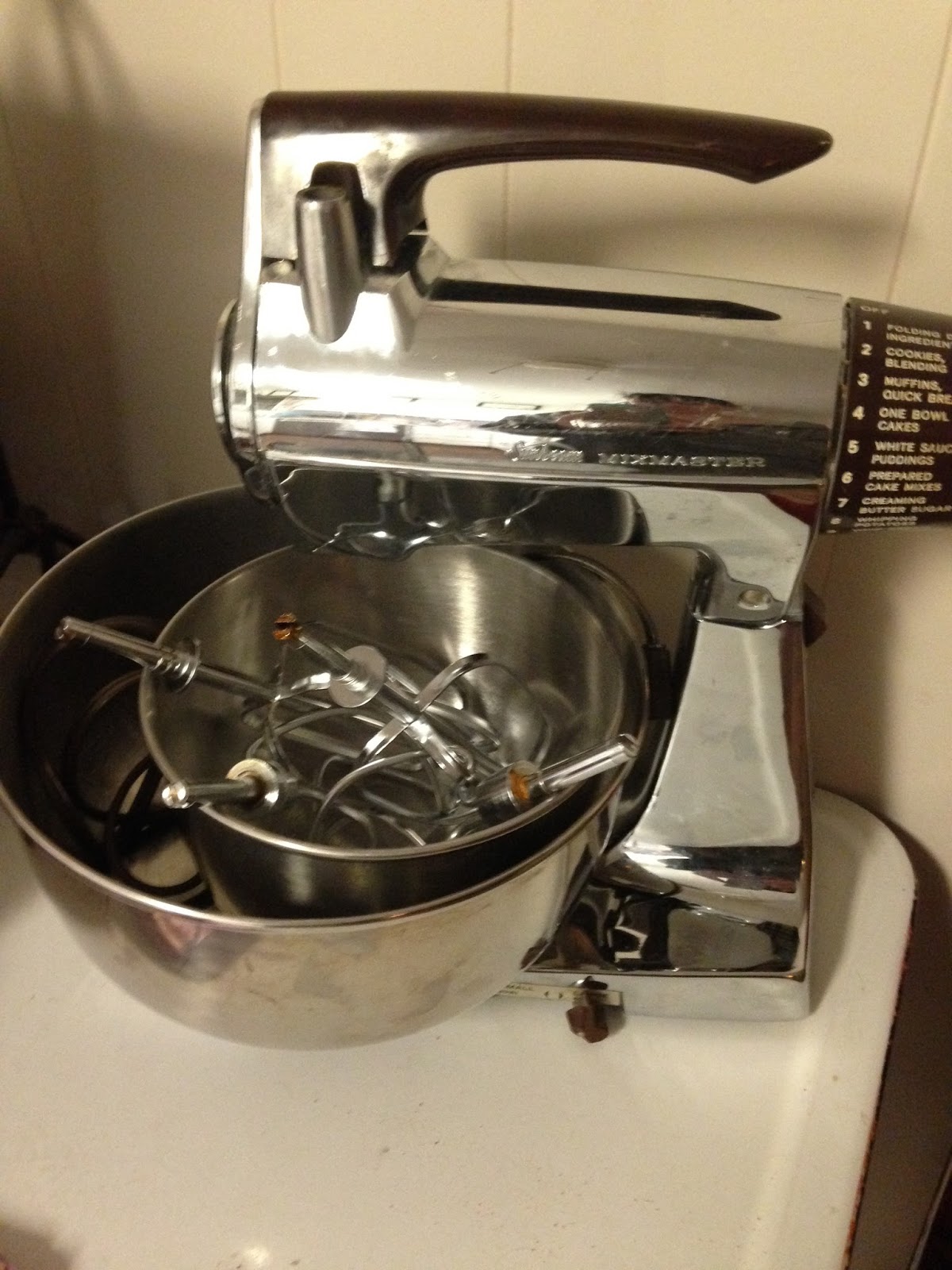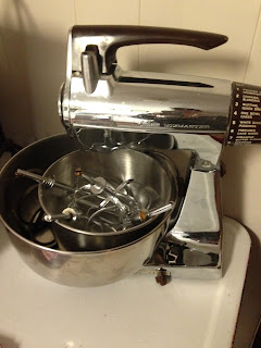 I am so excited!!! For my birthday, my in-laws sent me some birthday money and with it I went on eBay and purchased myself a "new" kitchen appliance. This is how I get ALOT of my kitchen equipment that I cherish so much. My agreement with my husband is that I always spend my birthday money on myself and not a bill and that I will spend it on something that I wouldn't purchase for myself - usually because I think: "They want me to pay HOW much for WHAT?!?!" For this year's birthday, I got myself a vintage Sunbeam Mixmaster!!!! I grew up with my grandmother's Mixmaster and that thing worked GREAT. This one is probably a little bit later model than my grandmother's - I think hers was from the fifties and this one is most likely from the sixties. And it isn't one of the more collectable ones that come in the pastel colors. But I already have a pastel pink KitchenAid mixer that my husband got me as a gift one year and, because I didn't care if it was a pastel color, I was able to get my Mixmaster for under $45.