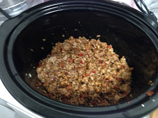 2. Once the meat is ground, microwave the chicken and garlic in a bowl, stirring about every two minutes until chicken is no longer pink, about 5 minutes if you're meat is already ground, about 8 minutes if you ground your own chicken. (I know this step seems weird but this is a very important step. This step allows the ground chicken to become firm enough to crumble coarsely without turning grainy in the slow cooker.)