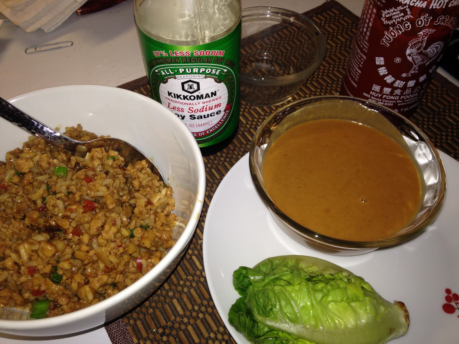 9. Serve chicken with lettuce leaves, spicy peanut sauce, Sriracha chili sauce and soy sauce for dipping.