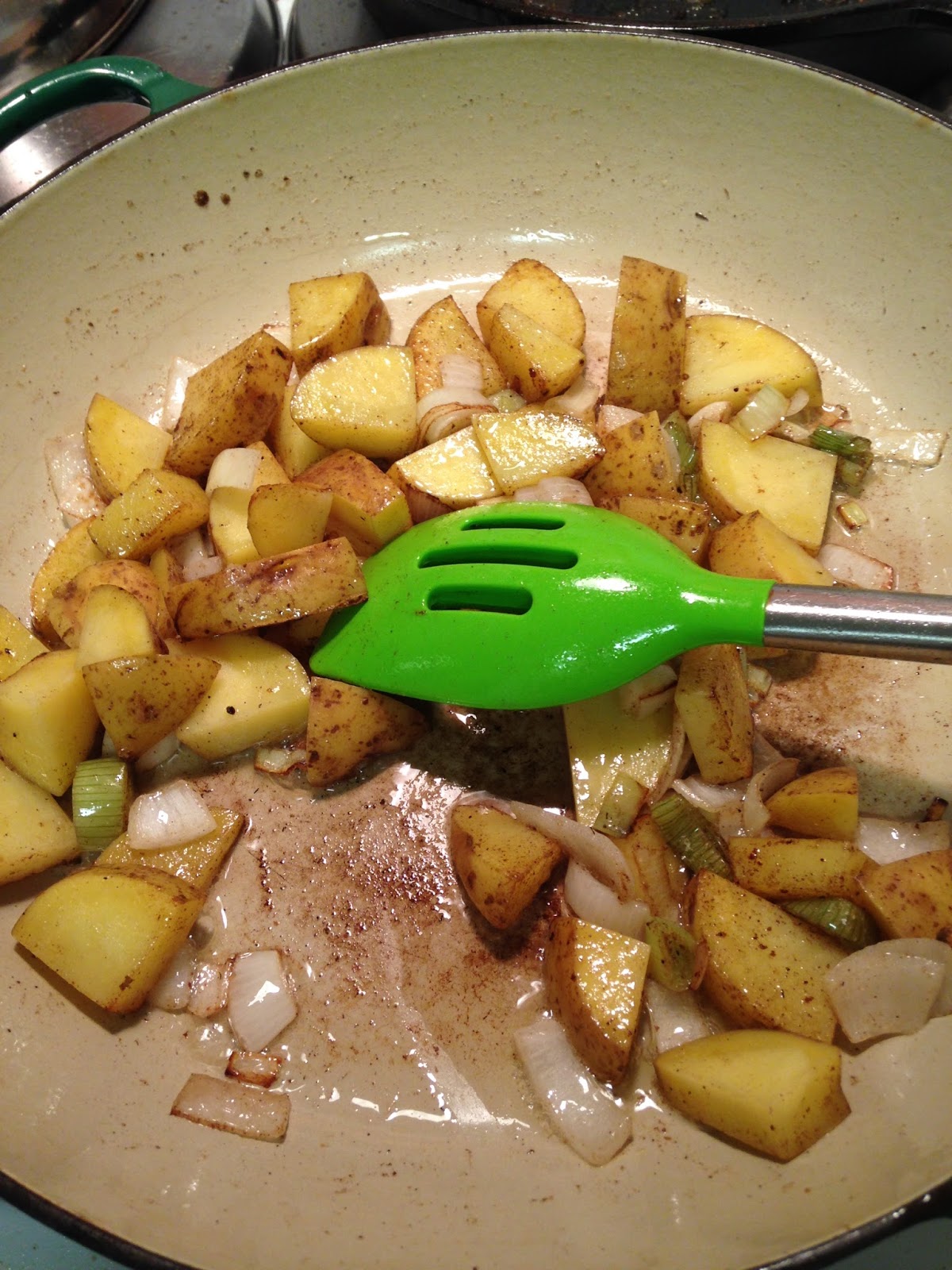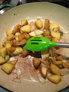 5. Add the onions and a potatoes to the skillet and cook for 5 minutes.