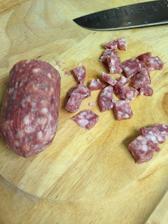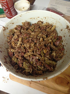 2. In a large bowl, combine the ham, salami, onion, Worcestershire sauce, vinegar, sriracha sauce and tapenade. Gently fold in with a spoon until everything is combined.