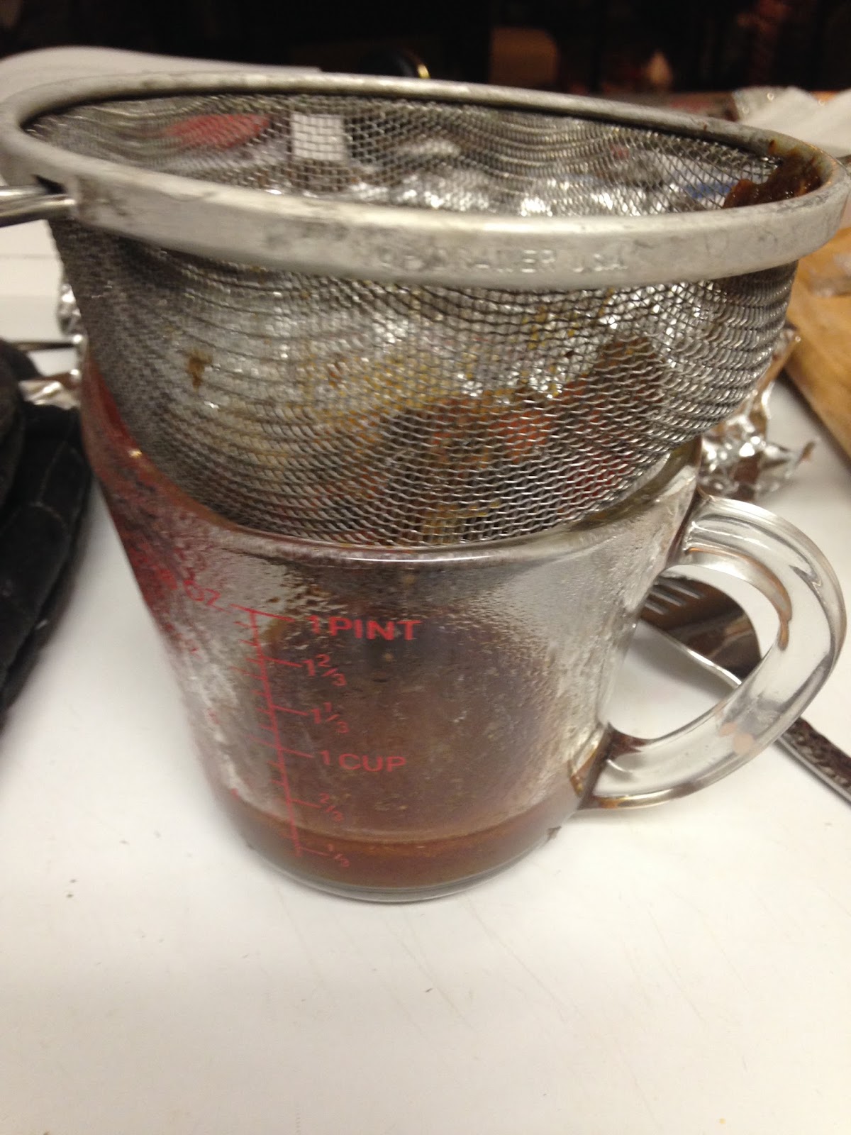 14. Let the liquid sit for about 5 minutes. The fat will rise to the top. Remove the fat by skimming over the top with a spoon. You will most likely need to add the remaining beef stock that you had on reserve to make about 3/4 cup liquid.