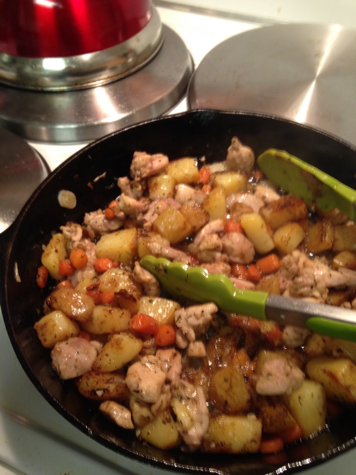 6. Let onion, carrots and potatoes cook for five minutes and add garlic and chicken. Stir frequently. Add 1/2 tsp. of the dill, 1/2 tsp. of basil and 1tsp. ground mustard and stir to combine. Cooking for about five minutes.