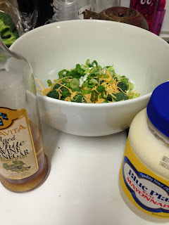 1/4 cup finely chopped onion (I like using red Vidalia onions, but I didn't have them, so I used the giant green onion that I had on hand. In fact, I used the green parts of the onion that I hadn't used the night before.)