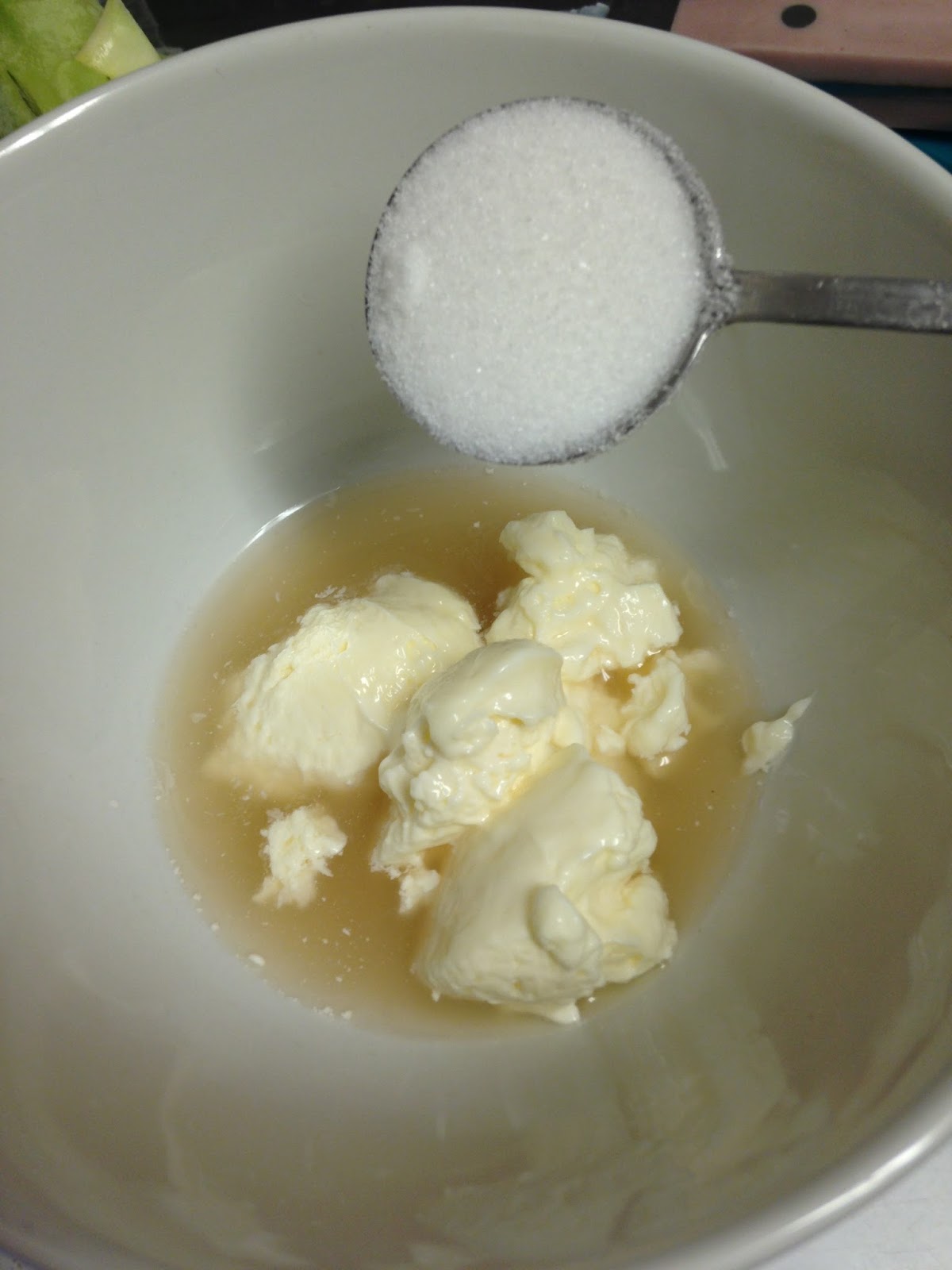 3. In a small bowl, combine the mayonnaise, white wine vinegar, and sugar. Whisk with a fork until all ingredients are smooth and creamy.