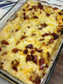 To serve, remove from baking dish and sprinkle with creole seasoning. (Taste the casserole before you do this, depending on the bacon and the cream of chicken soup you used, this may be salty enough for you. I always try to use low sodium everything on my dishes so that I can try to control the salt, so I usually find that it is okay with an added sprinkle but tasting first never hurt anyone.)