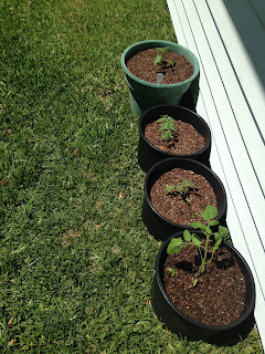 These are my little tomato plants and my pepper plant is in the green pot. (Fingers and toes crossed that they will thrive.) |