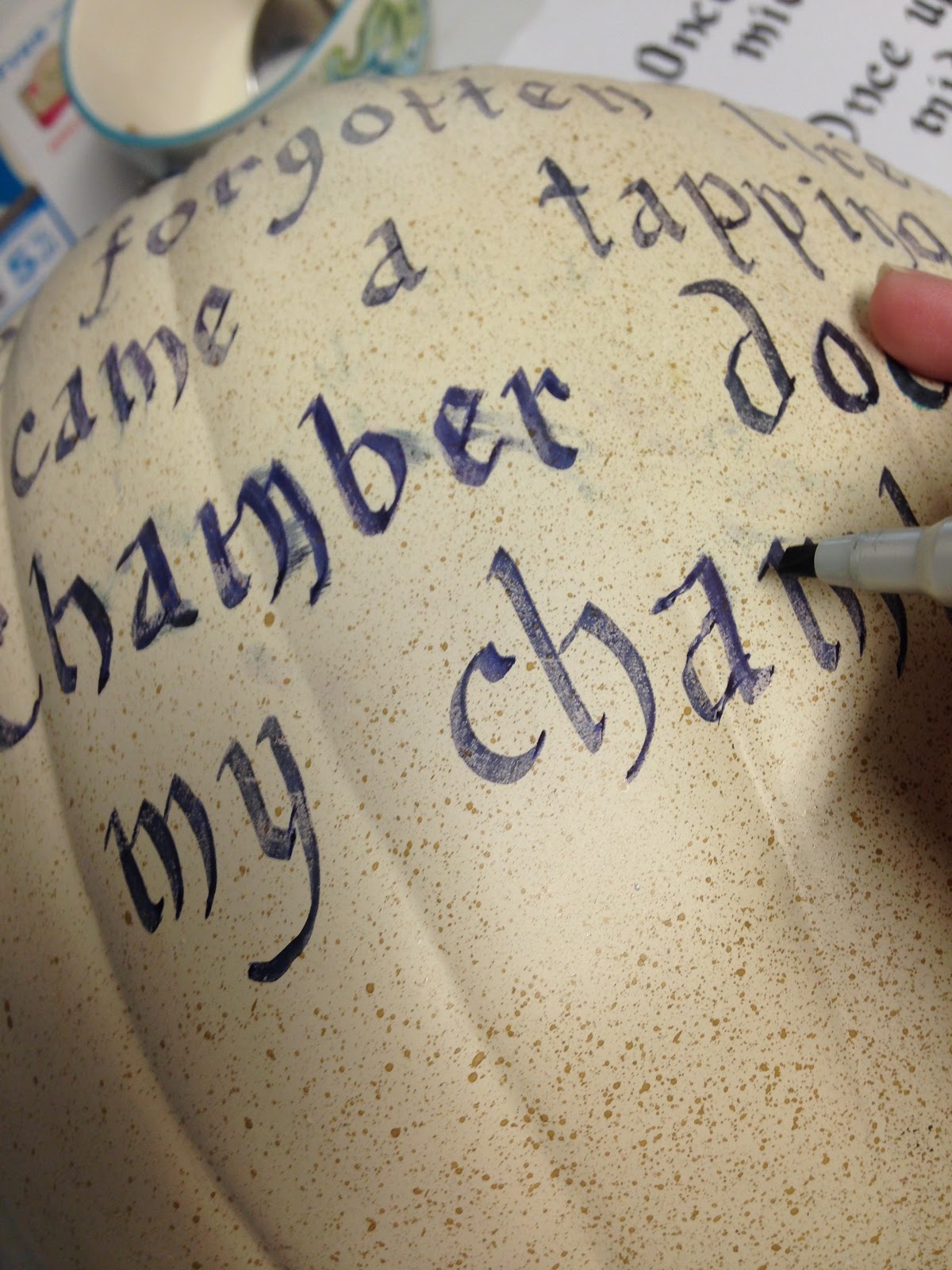 4. Once the lines are drawn remove the tape. Using a calligraphy pen write down as much of the poem as will fit on your pumpkin.