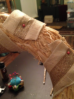 3. Wrap the ribbon around the wreath. You can cover the straw completely or you can leave some showing. My husband really liked the straw and thought that it looked very Fall. I kind of agreed with him, so I left about two inches of straw showing between each spiral of the ribbon near the center of the wreath.