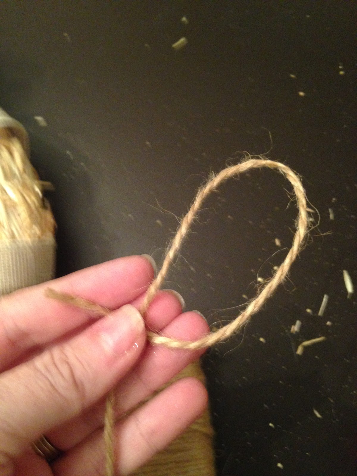 9. At this point, the wreath is almost completed. Now you have to make it hang-able. Take some twine and cut it at about six inches. Make a loop and tie together at the ends with a double knot.