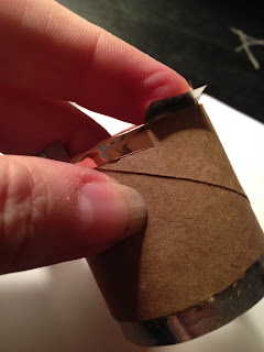 7. Cut the slits into the excess vinyl. Basically following the same pattern that you would use to cut pizza or pie. First slitting in half and then in quarters. Fold the edges down onto the front of the toilet paper roll going all the way around the edges on the top and the bottom.