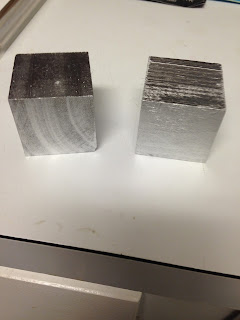 1. Spray wooden blocks with chrome spray paint leaving the bottom unpainted. OR paint the blocks using silver acylic paint. (I find spray painting easier.)