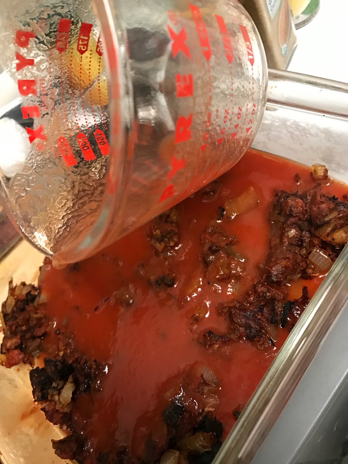 9. Transfer the roasted tomato mixture to a square baking dish. Stir in the reserved tomato juice mixture that you set aside. Stir until the roasted tomatoes have "re-hydrated".