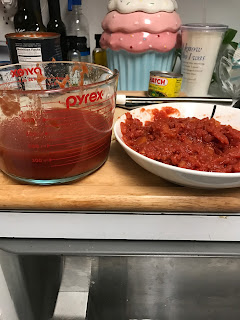 3. Drain tomatoes in a fine mesh strainer placed over a bowl or large liquid measuring cup. Press the tomatoes down with your spatula, and I mean really press down as you want to try to make the tomatoes as dry as possible and remove as much juice as you can. I have a small strainer, so I had to do this in batches and had to place my tomatoes in a small bowl to the side after they were done draining and then move on to my next batch.