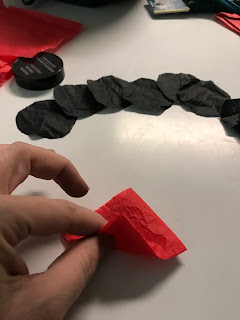 21. Take all eight of your red tissue paper petal squares and place them in a fairly even pile. Don't worry about trying to line them so that they all face exactly the same. Then place your eight black circles in the center of your petal squares.