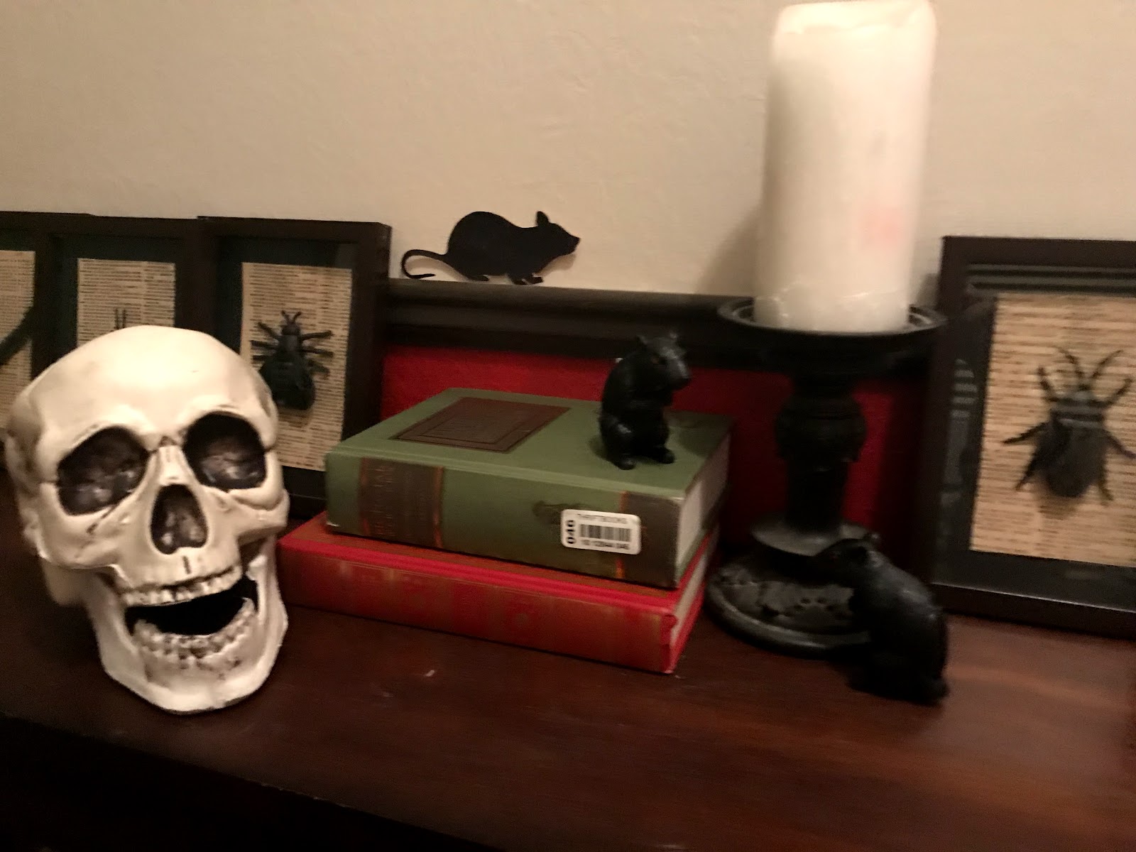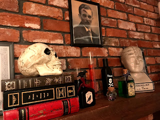 The first step back to claiming my life and my space was to decorate my living room and mantle. I still had the summer decorations up. Which, I understand that Louisiana is hot, but that is still no excuse to not try to bring in the season with fall decorations. This year I decided to go with a Dr. Jekyll type theme for my Halloween decorations. It was all inspired by my husband's Phrenology bust.