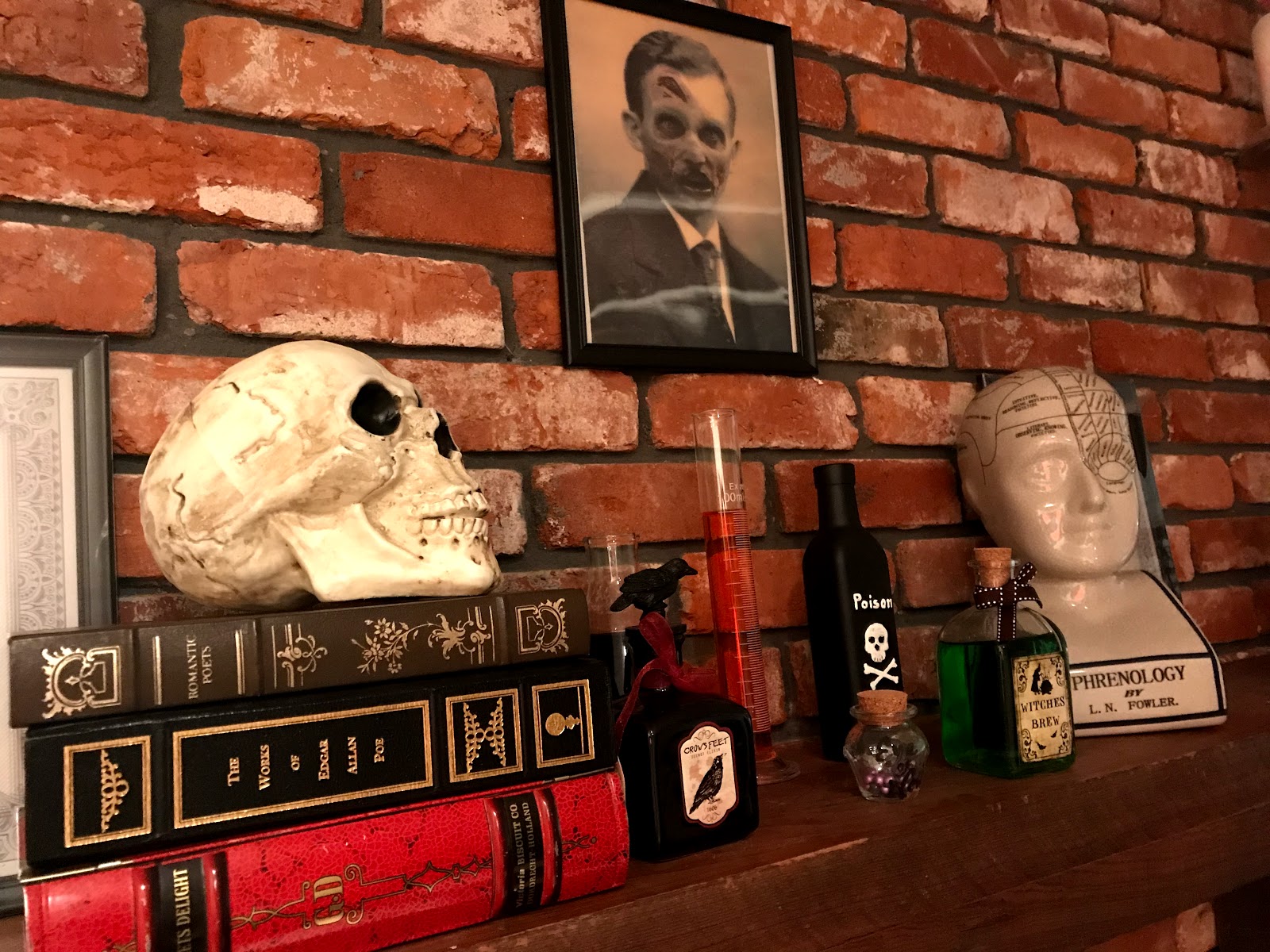 Here is a another angle of the close up of the mantle. As you can see, I stole books from the pub library. I tried to keep with the theme of a 1800's doctor so one is a book of poetry and the other is collected stories and poems by Edgar Allen Poe. I don't know if I have told y'll this or not, but I read a collection of Poe cover to cover every year during October. It is a Halloween tradition for me.
