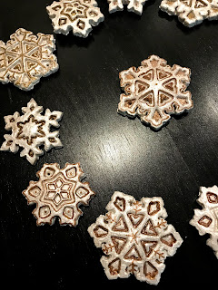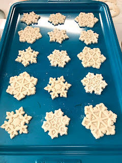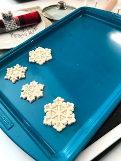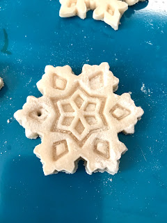5. Cut out the ornaments using your cookie dough cutters. I used some snow flake cookie cutters that I got as a stocking stuffer for Christmas last year. I believe that mine were actually pie dough cutters from William Sonoma, but you can use any holiday cookie cutters that fit your tree decor. You can do very simple and get the cookie cutters that just cut out the outside of the dough but, for fancier ornaments, I suggest you use the cookie cutters that make impressions in the dough as they cut out the shape. If the dough is sticking to your cookie cutters, just dip your cutters in some all purpose flour
