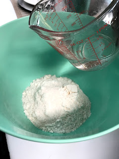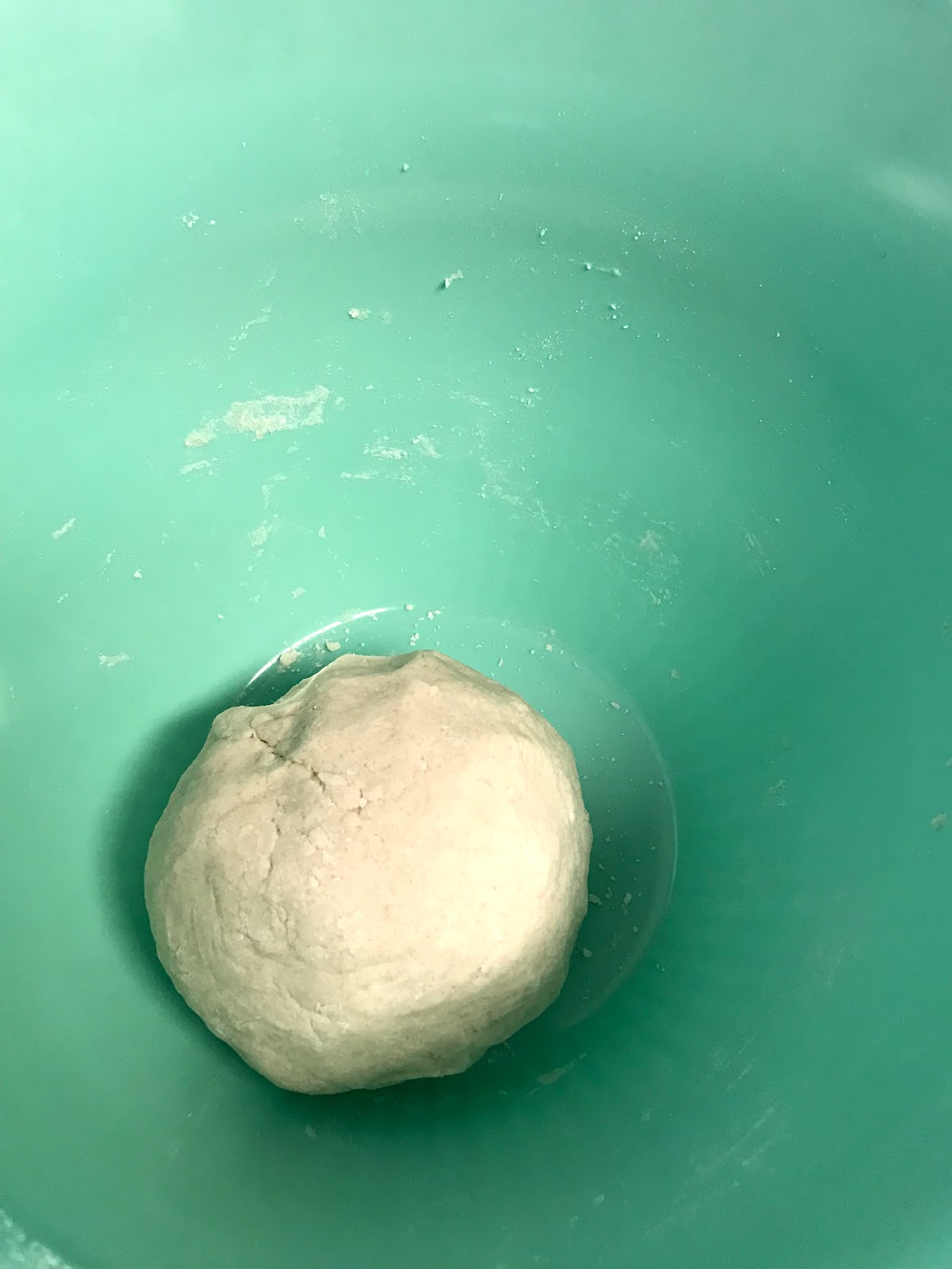 3. Start the mixing process with a spoon and then use your hands to complete the mixing process. Once everything is combined the dough should have a similar consistency to play dough. If your dough is too wet and sticky, add more flour until you get the right consistency. (This batch I actually used my half cup and then add about another 1/4 cup flour to get the right consistency.)