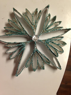 10. Using a hot glue gun, put glue in the center of a sparkly button and press the sparkly button into the center of the snowflake.