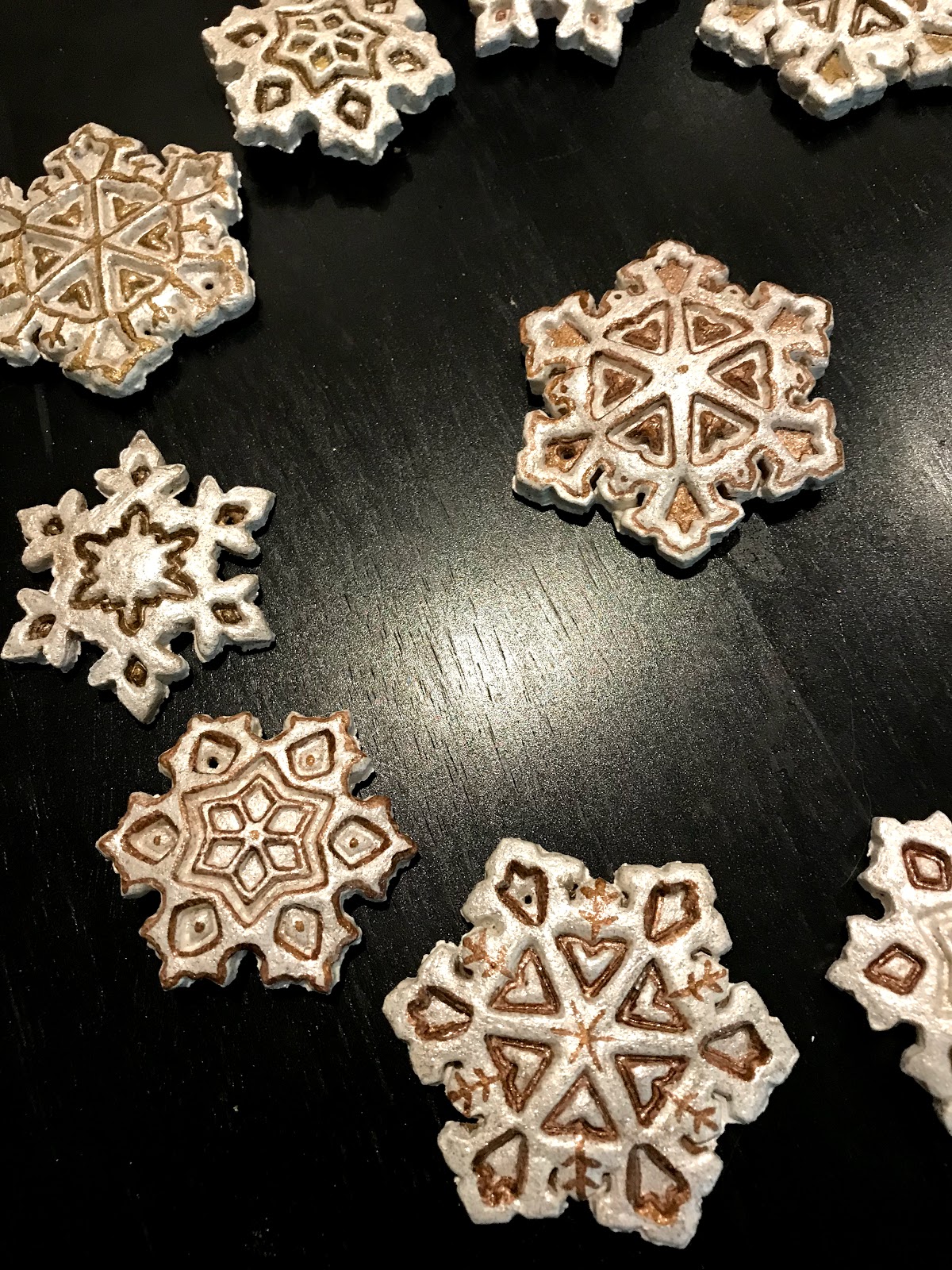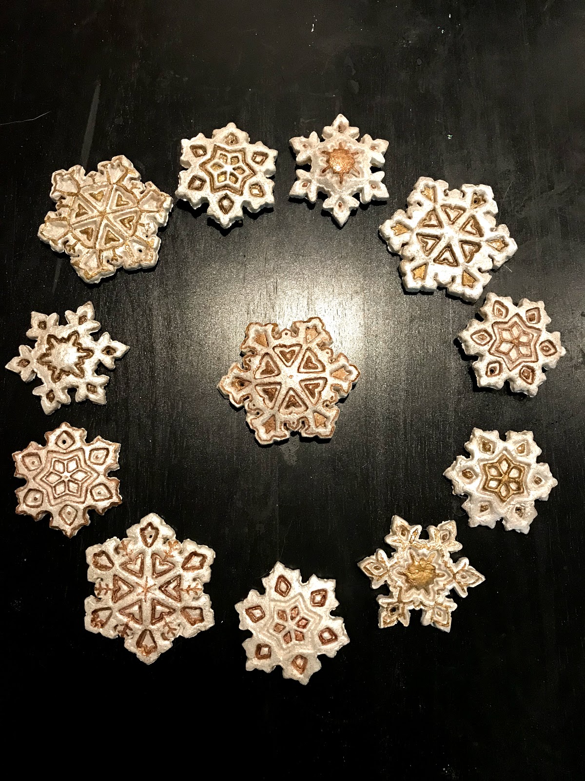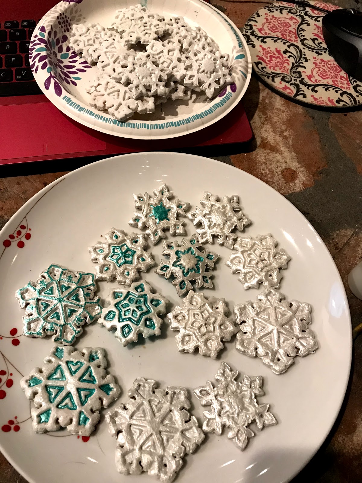 9. Let the ornaments cool completely and then start painting your ornaments. I don't have pictures of this. I think that painting your ornaments should be a personal thing. You do what you find to be beautiful. Since I had two dozen ornaments, I made two different sets of snowflake ornaments, one in gold and one in turquoise.