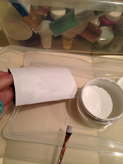 2. Paint the toilet paper roll your main snow flake color of choice. For this demonstration I painted one toilet paper roll white and the other turquoise. You can do any color that you would like. Metallic paints such as gold and silver are always pretty, as are the traditional colors of red and green, but you do whatever colors will work for your Christmas tree. At this point only paint the outside of the roll. (A word of advice. If you are doing white snowflakes, pearlescent is gorgeous, but it will add a step to your snowflake. You will want to paint the roll with regular white acrylic paint first and then, after it dries, paint over the white with your pearl white paint.)