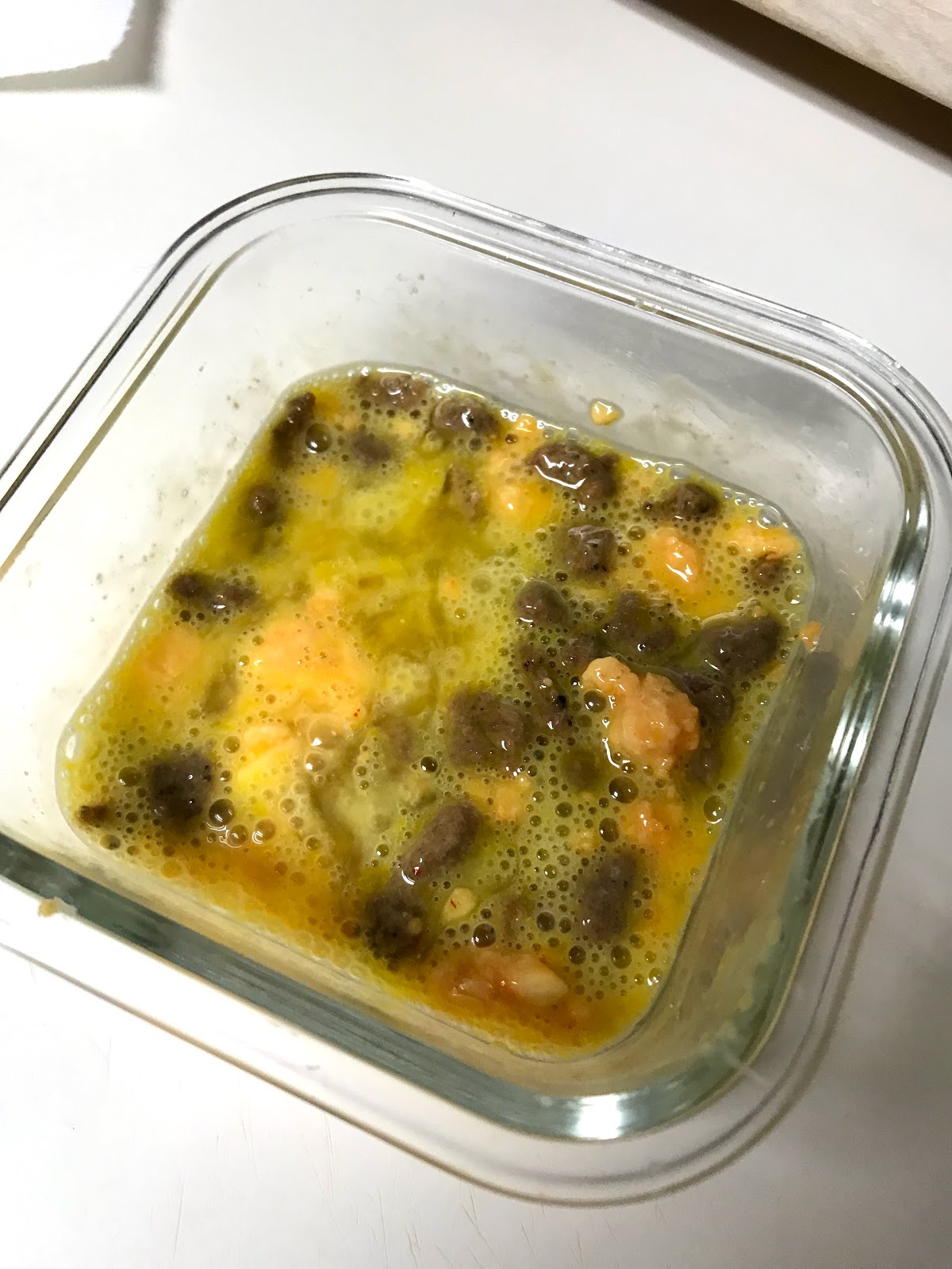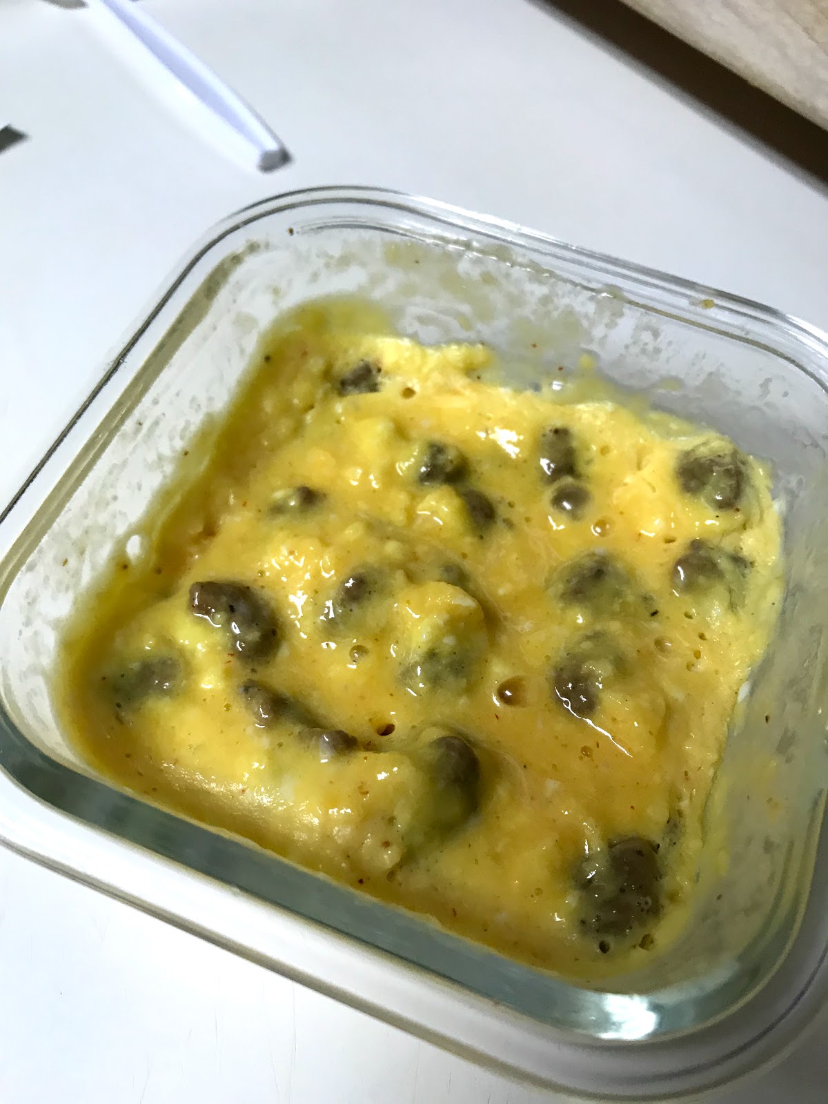 With a fork, lightly beat the egg, sausage and cheese until they are "mixed" together.