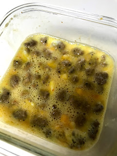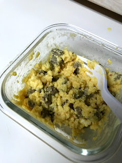 1. The night before, or in the morning, put all of your ingredients into a small, glass dish. (Don't crack the egg.) I like to use the small, square, single serve, dishes that are made by Systema and you can get for about $3.00 at Marshall's. But any microwave safe dish that has a lid and is about the size of a tea cup will work. I have actually made this dish in a tea cup. It looks so cute!!!