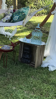Two things this "temporary" outdoor space has taught me is that I definitely want to be able to have electricity in my permanent outdoor space - if for no other reason than that I would like to have a ceiling fan. If I could have a constant breeze, it would make lounging so much nicer.