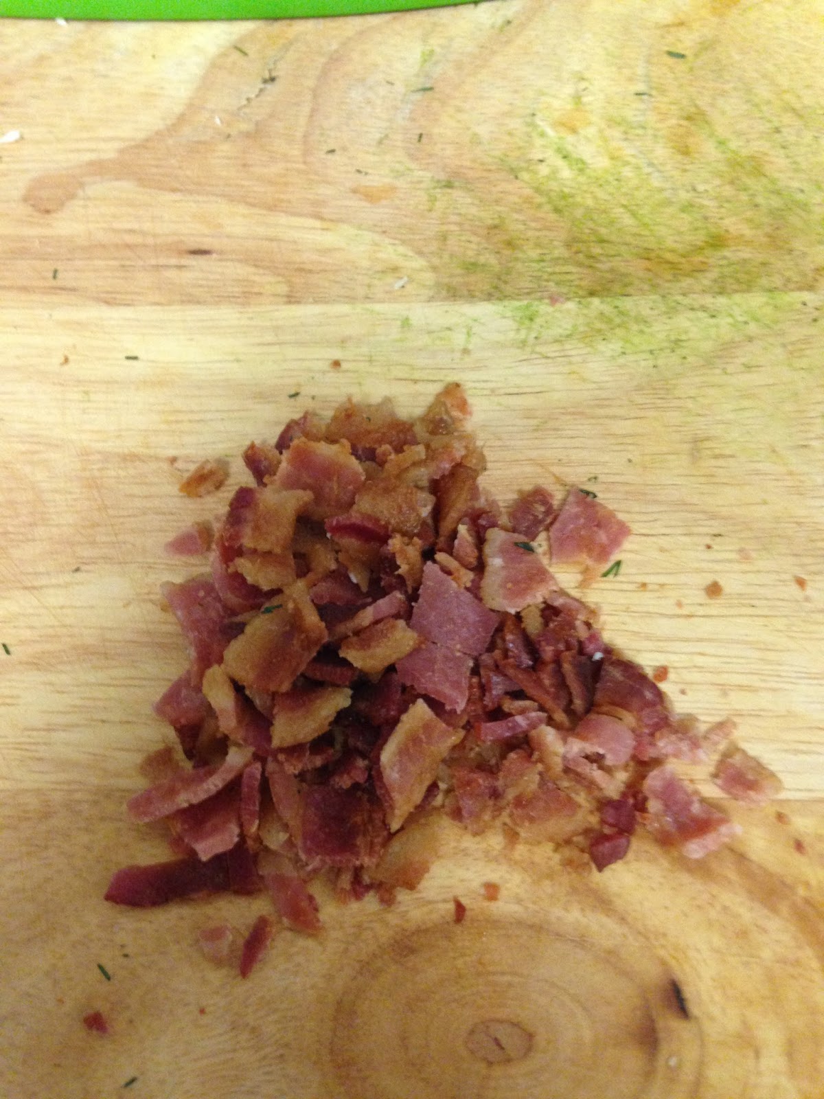 2. In a medium size bowl combine ALL remaining ingredients, except for the bacon. Stir until all the ingredients are smooth. Taste, if you feel you want to add more of something, go for it. This will be a strong flavored dressing. When you are tasting it, remember that it will be going with your roast chicken. If you used the recipe from Saturday's post, then you will want to add plenty of herbs. If you made a chicken with more herbs, you may want to reduce the herbs so that the flavors don't clash or over power one another.