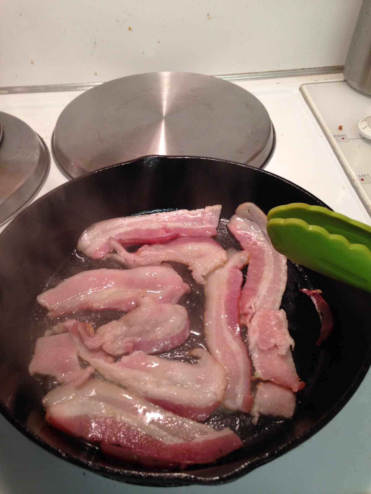 2. Using a large heavy bottomed skillet, (I like cast iron.), over medium heat cook the bacon until crisp. Set aside on a plate with a paper towel, to soak up some of the grease and save for later. Reserve the bacon grease.